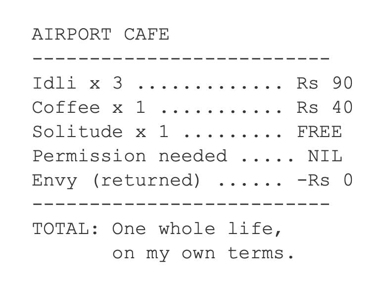 I speared another idli with my plastic spoon and smiled at the absurd, liberating truth of it.